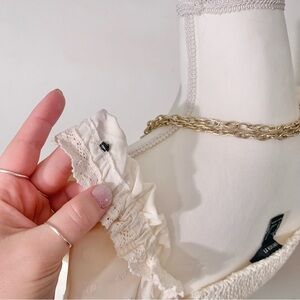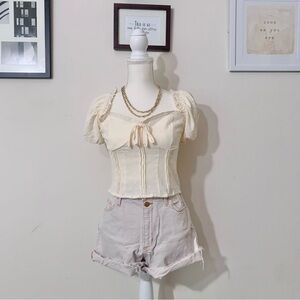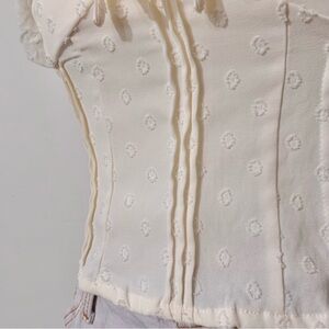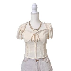 Forever 21 Cream Bustier Crop Top Puff Sleeve Ruched Blouse Polka Dot Stitched Elastic Lace Trim Bow Tie Front