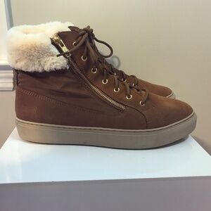 Waterproof, side zip accent, suede/nylon upper, faux-lapin fur collar, tonal hardware, stitch details