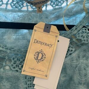 NWT Fun and cute crotchet top with a blue tie-dye print. Wide, flowy sleeves and a boat neck. Never been worn!