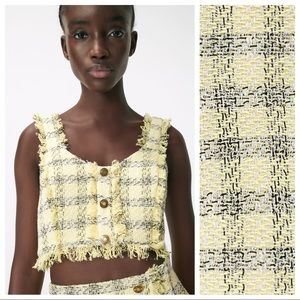 NWT. Zara Yellow Textured Frayed Crop Strappy Top with Buttons, round neckline, front buttons detail, lined, side zipper closure. Size L. Ref. 3215/153. Pit to pit 18,5" flat, length 15". 1068.