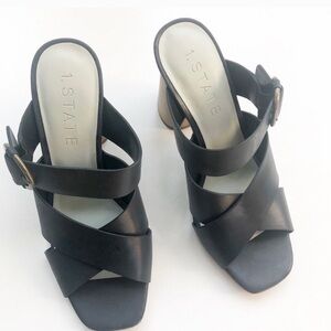 A gorgeously flared heel furthers the attitude of a smart, breezy mule shaped with gracefully contoured, crisscrossed straps and finished at the side with a perfectly round pin buckle.