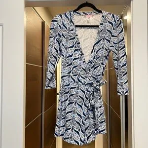 Adorable romper with a wrap waist. Stretchy material - so it is extremely comfortable.