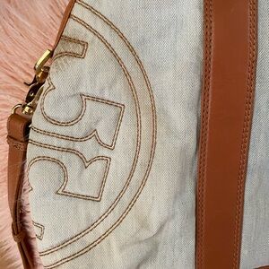 This awesome Tory Burch bag is perfect for a number of reasons: roomy, stylish and useful. Light denim with a light brown accent. There is a Tory signature brand in brown stitching on one end. The zipper pulls (top and inside) and strap bars are branded and nice and bright. There is a removable crossbody strap.