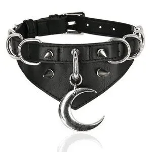 Crafted from premium leather, this choker features a striking crescent moon pendant and multiple metal D-rings, evoking a sense of gothic allure.