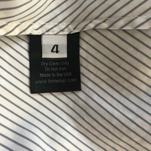 Wide ties wrap at the front of this pinstriped Tome top. Long dolman sleeves. Button half-placket.