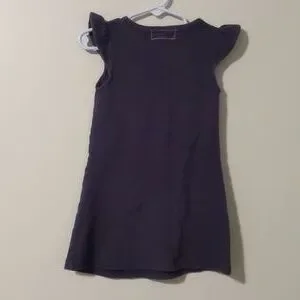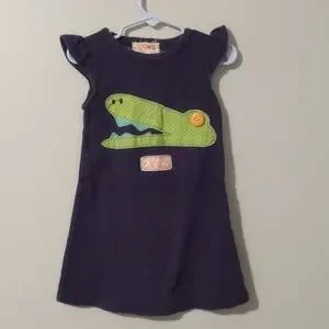 This navy 2T dress has ruffle sleeves with a sewed on alligator (button eye) and a patch that says "EVIE" the name looks to be handwritten.