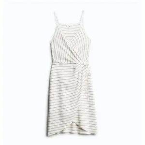 Super cute and comfy dress that is easy to dress up or down. The dress is white with thin black stripes, a tulip hemline, and faux wrap detail