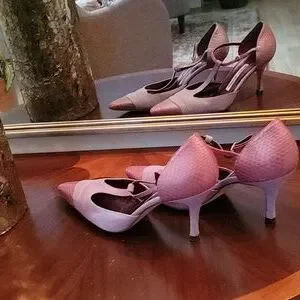 These 3" Manolo Blahnik snake and denim combination two-tone pair of heels are absolutely a work of art. They will embellish any stylish lady's closet. Me, I can no longer wear or look good in heels. So, please, give them a happy home.