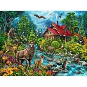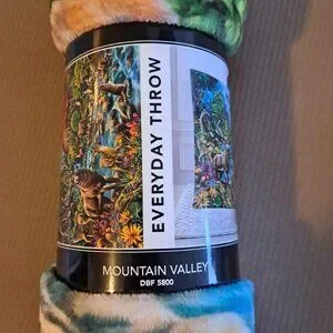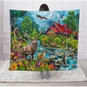 Transport yourself to a serene forest with this vivid and brand new throw blanket. Watch majestic deer and other wildlife roam freely in front of a cozy cabin, nestled by a flowing stream. A perfect blend of nature and comfort for your home.