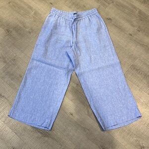 J.Crew Cropped Linen Pants, wide leg in light blue color. Pull on, elastic waist with tie. Inseam is 24”.