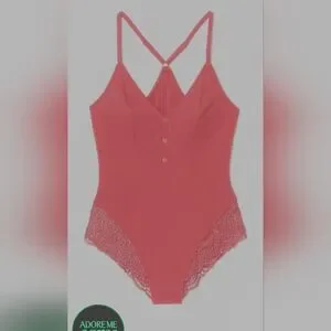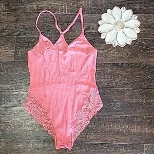 NWOT, Adore Me Pink Bodysuit size Med, The Emilia is a cozy and cute rib knit bodysuit with a V-neck and lace racerback design. Adjustable shoulder straps, This feminine and flirty lounge piece comes in Tea Rose and is perfect for lounging around the house. This item is in New Without Tag condition