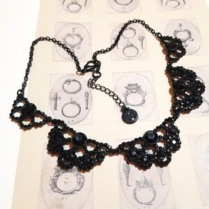 Beautiful Vintage designer signed Liz Claiborne established in 1975, Black Rhinestone Necklace. The metal is blackened. Reminiscent of the old Mourning Jewelry. In Excellent Vintage condition. Measures 16.5" to 18.5". You'll love this Exquisite Black Beauty.
