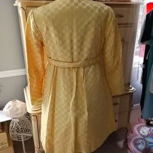 SHE IS STRAIGHT OUT OF THE 1960S AMD IN MINT CONDITION! UNION LABEL , "ORIGINAL JR. THEME", NEW YORK! NO SIZE TAG FOUND. BOTH PIECES ARE FULLY LINED WIRH LEMON YELLOW SATIN, DRESS IS AN ICONIC 60S STYLE WITH LONG BACK METAL ZIPPER. THE COAT 8S JUST PRECIOUS WITH HER COVERED SMAP BUTTONS, LONG SLEEVES AND ATTACHED BACK BELT, EMPIRE SYLING WITH A FULL FIT. FABRIC IS LIKE A SIK BLEND, BUT NO FABRIC INFO. I DID NOT STEAM HER BECAUSE AFTER BEING MADE OVER 60 YEARS AGO I THINK SHE'D APPRECIATE A DRY CLEANING. THE FABRIC IS SO CHANEL AND J.CREW ALL WRAPPED IN ONE. ROWAN AND MARTIN'S LAUGH IN WOULD HAVE LOVED THIS!! MEASUREMENTS TO FOLLOW SHORTLY!