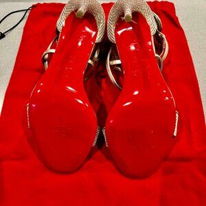Show off those RED BOTTOMS with these STUNNING Christian Louboutin heels. Choca 100 Specchio/Glitter is a platinum color, so it matches gold and silver. Size 40.5 fits like a US Women's 10, 100 mm heel height is 3.9 inches. Worn once for an event. Very slight scuffing on bottom, but red is not worn off. Comes with original box from Barneys New York and red dust bag to protect shoes.