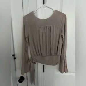 3/4 bell sleeve dusty purple/gray top. Tie waist, surplice style cut with gathering on the shoulders and at the back. Acid wash style fabric. Top hits like a long crop