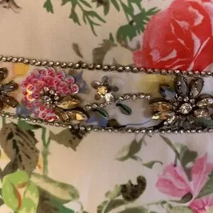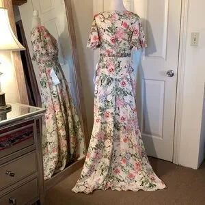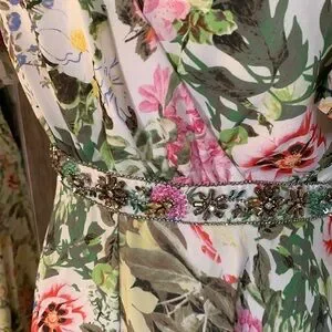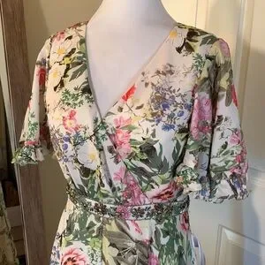 Floral surplice maxi dress with a faux-wrap -neckline, ruffle-trimmed short bell sleeves, and a pleated full length skirt. The waist is accented with a floral rhinestone-embellished belt.