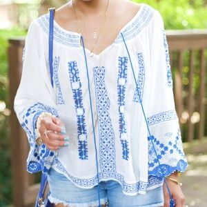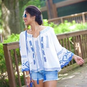 Beautiful rare top bohemian white and blue embroidered design. Can be worn off shoulder. Shoot me an offer!