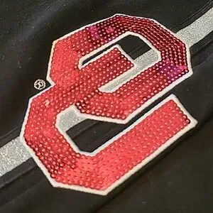 Sequins OU on left thigh.