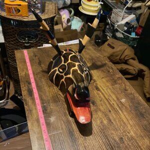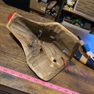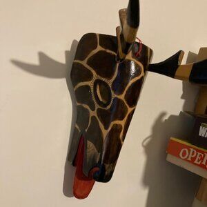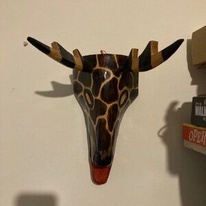Guatemala Magan deer mask. It is a brown and yellow deer mask hand carved and hand painted. It is ethnic handmade mask art. It is 13" long and the ears come off for easy shipping.