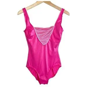 Hot Barbie pink one piece vintage swimsuit with striped detail bodice