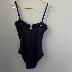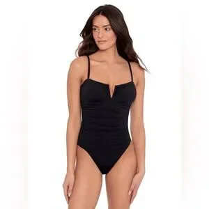 Ruched detailing and adjustable shoulder straps give a flattering fit to this chic V-wire one-piece swimsuit from Lauren Ralph Lauren.
