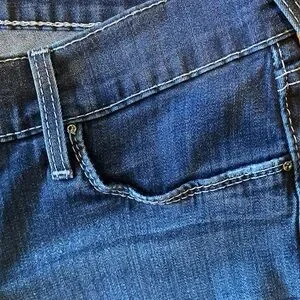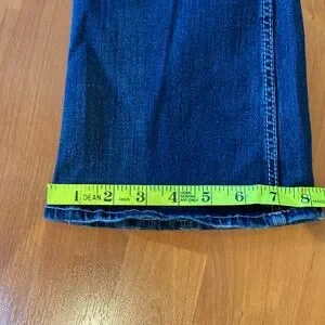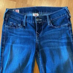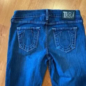 This True Religion Bootcut Jean is a lighter weight denim that is stretchy. Faux front pockets, bootcut and rhinestone label on back. Size 26