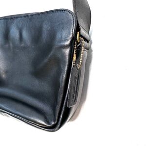 Vintage and Authentic Coach Promenade bag. This 3 pocket purse is a large camera bag style with tapered and wide adjustable strap. It is mad of black gloved tanned leather and is an ergonomic style and easy to carry bag for everyday. It has a main compartment that zips closed and two side pockets with magnetic snaps. The interior is reverse leather and suede.