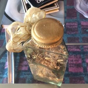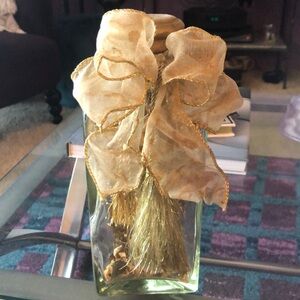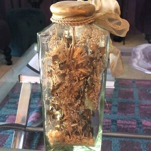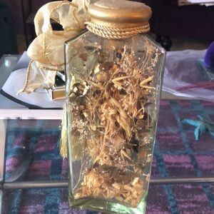 Clear glass triangular shaped jar with a golden rubber cap. Inside are golden toned dried floral pieces. Tied with a golden tassel cord and a golden wired bow with a gold tassel accent.