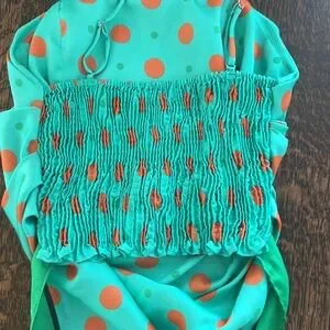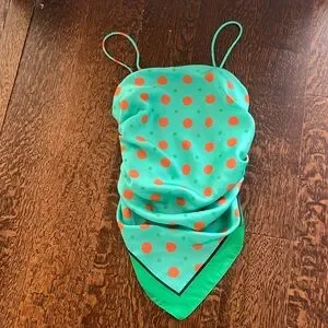 Green hue with all over polka dot print, adjustable spaghetti strap, 3 side pleats, elastic back panel, front scarf panel is linned, can be paired with jeans, shorts, skirt, any occasion for summer heat.