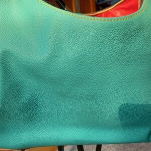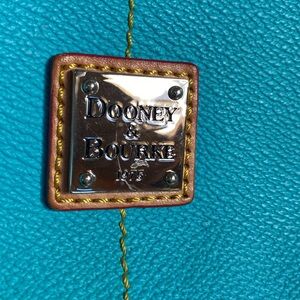 Dooney & Bourke gently used teal and brown handbag. Red interior.