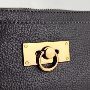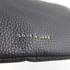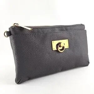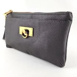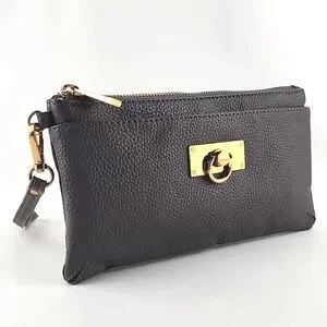 Excellent pre-owned condition, Love & Lore wristlet clutch in a dark grey pebbled faux leather with a top zip closure and front slip pocket with clasp. Features a top zip closure, detachable wrist strap and gold-tone hardware.