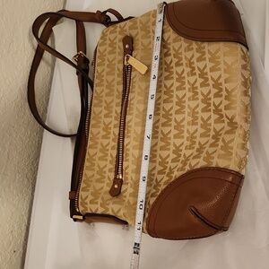 Michael Kors fallon medium logo jacquard messenger bag, color: caramel brown, adjustable straps, could be crossbody or shoulder bag, used once condition.