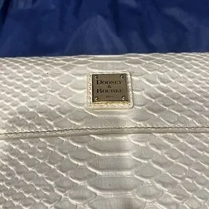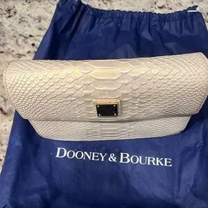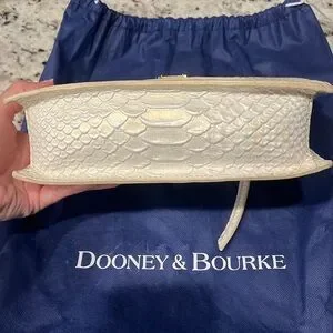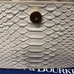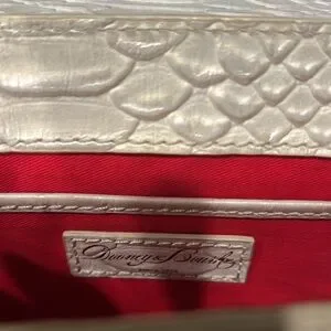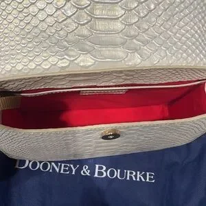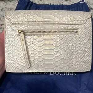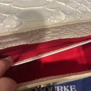 Python embossed leather. Prestine condition, comes with dust bag. Stone gold tone hardware. Gold over flap closure. Inside slip and cell pockets w/ key clip. 24" adjustable xbody removable strap. Can be carried as a clutch as well.Rear zip pocket. Approx 9.5"L x 6.75"T x 2.75"D. Pearl white color with red interior. Shoot me an offer!