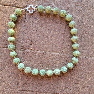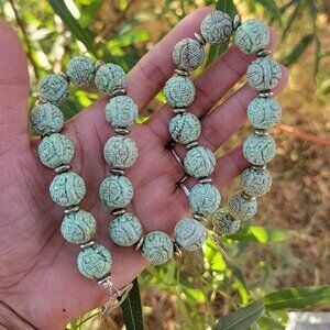 Absolutely stunning RARE Chinese natural green turquoise carved shou beads sterling silver 925 heavy necklace