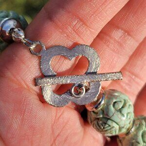 This is a museum quality necklace and deserves to be displayed when not worn :). It features large and genuine weighty 14-15 mm Chinese shou beads. Natural blue green turquoise with natural brown matrix. Handcarved Chinese characters. Absolutely amazing. Separator beads tested as sterling silver plated. Fascinating large solid 925 sterling silver toggle clasp. Weighs about 127.8 grams. Research shows this necklace starting at $800 - $4,000 in a less rare blue turquoise instead of this turquoise with a fasinating unique color. Natural, beautiful patina included. May need a cleaning depending on your preferences. Tested with a neodymium magnet and JSP acid, parts listed as sterling in description are guaranteed.