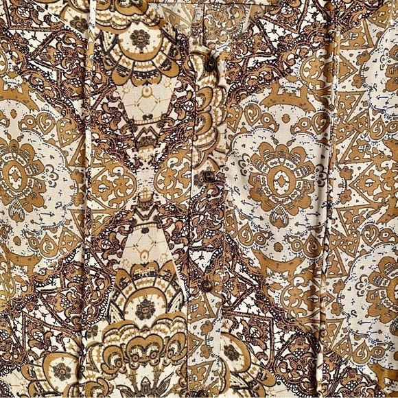 Soft, drapey material. Button down. Tie at neck. Muted, autumnal colours. Seventies style retro pattern. Bottom side slits. Sleeves can be worn down (full length) or buttoned up (for a slightly shorter, slouchier look). Would look great paired with high waisted jeans or trousers.