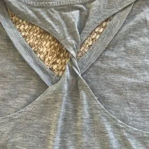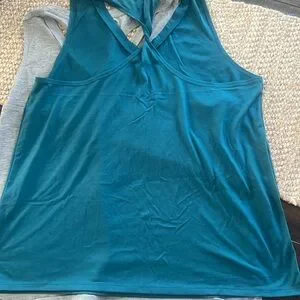 Set of two active tanks. Gray and teal. Cute twist detail in back. Measurement from pit to pit 17.5in and from top to bottom 24in size medium. No rip or stains. Smoke free home. When you purchase you are getting both. Go dry material.