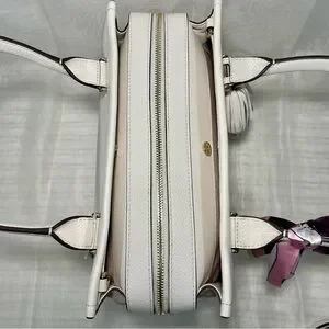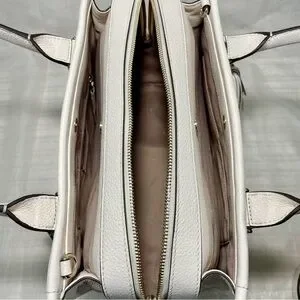 @bcsteelman The color is listed as Parchment and I took a picture of that part of the tag with the color listed. The tag is bright white and I took it against the purse for comparison. It is like the beautiful parchment stationary that is just a hint of white but not creamy in my opinion. I hope that helps and appreciate you looking in our closet. This is a beautiful purse never used and kept in a dustbag at all times in the home.