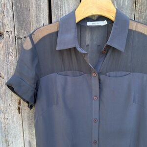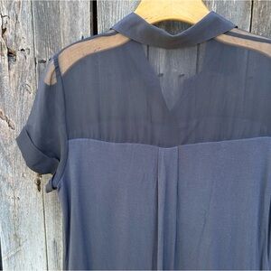 Chic classic minimalist silk and rayon short sleeve shirt dress with sheer neckline and sleeves