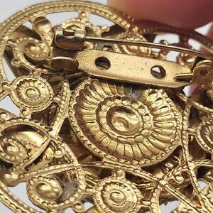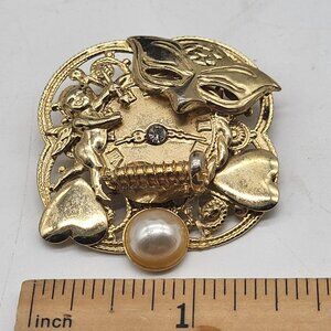 VTG Gold Tone Brooch Pin Mask Cupid Hearts Faux Pearl Time