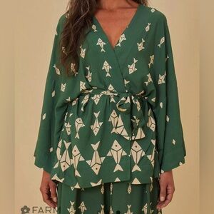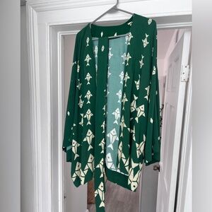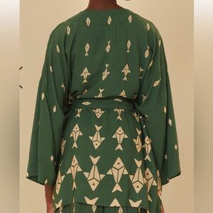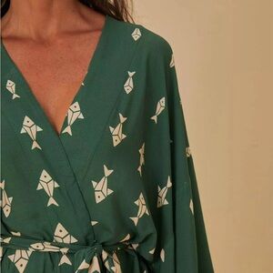 Flowy, green and white fish design flowy kimono top with drop shoulder flowy kimono sleeves. Includes loose waist tie.