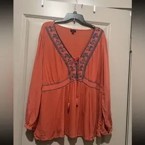 Orange long sleeve lace up top with blue embroidery