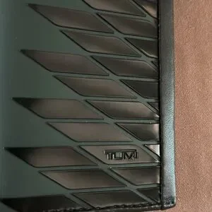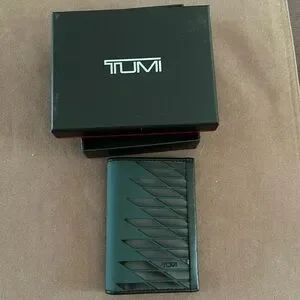 Beautiful, dark green and black leather wallet by Tumi. This is from the Alpha collection and is a multi window card case three slots on each side window inside and window outside the wallet. Measures 4.4 x 3.1.