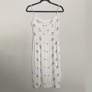 Vintage White Linen Floral Print Embroidered Midi Sun Dress Size Small