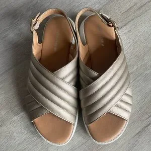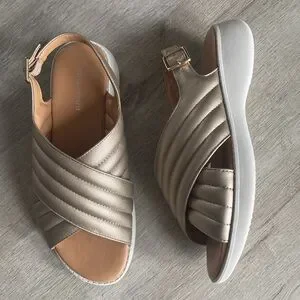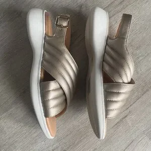 Brand new with tags! Easy Spirit Erin Comfort Casual Sandals in Gold Metallic. Stay stylish and comfortable with the Erin sandal. This sandal features fashionable puffy textured upper straps in a crossover pattern with an adjustable buckle strap around the heel. The cushioned insole offers superior arch support for all day wear and comfort. 1.57" wedge heel. Adjustable buckle back strap closure. Lightweight, flexible and durable outsole. Faux metallic leather. Women’s size 7.