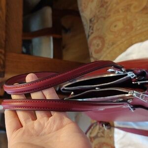 Coach Brooke cherry red leather and suede satchel. Style number F1881-F31418. Special price drop for the holidays! New with tag. Buffalo embossed, smooth leather and suede sides. Comes with care card, original retail tag, original Coach dust bag, adjustable and removable crossbody strap, unbranded bag scarf and unbranded bag charm. Silver hardware. Cherry red fabric lining. Two outside zippered sections and one center section that has a snap closure with three open slip pockets. Purse measures approximately 14 1/4 across by 9 inches high and 5 inches wide. Shoulder strap drop is approximately 8 inches and crossbody strap drop is approximately 21 inches adjusted and 26-27 inches fully extended. Call out: very small spot of color loss on one shoulder strap handle repaired using Angelus brand leather acrylic paint and matte acrylic finisher to prevent peeling and chipping. Comes from smoke free and cat friendly home. Accepting reasonable offers!