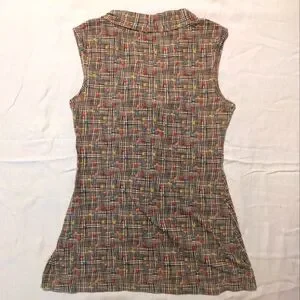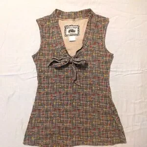 Decorative tie bow at center front, sleeveless, print has cross-hatching and polka dots.