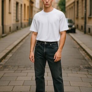 -Description: Classic straight leg styling, original zip fly, 100% Cotton, Medium Wash, Black Stone Washed Jeans