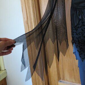 Very stylish! This Fallen Angel costume is highlighted by a sexy lace-up neck line and dramatic tattered sleeves in slinky black mesh. Flocked mesh overlay with slimming curved princess seams for an added hourglass effect. The skirt is triple-layered and tapers to the back for coverage and effect. Feather wings and halo are included.