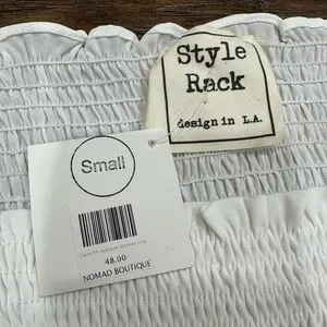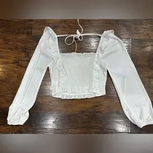 NWT white long sleeve boho blouse. Too is dotted around wrist with loose sleeves. Cropped fit with cinched front and back, cute ruffle detail!